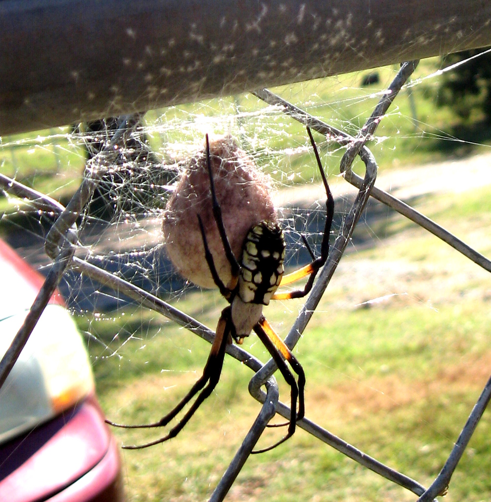 And she made that egg sac last night. That thing was not there yesterday. None of that was there yesterday. Last night, empty fence. Today, giant spider and super-enormous egg sac.